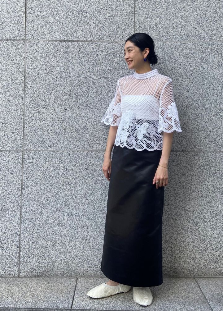 「これから夏にかけてどうしてもカジュアルなコーディネートになりがちですが、今年はエレガントなムードもほどよく取り入れたい気分。透かしレースのような編み地が1枚で着映えるニットトップスを中心に、レザーライクなサテンスカートやファーシューズなど、質感の異なるアイテムを組み合わせました」