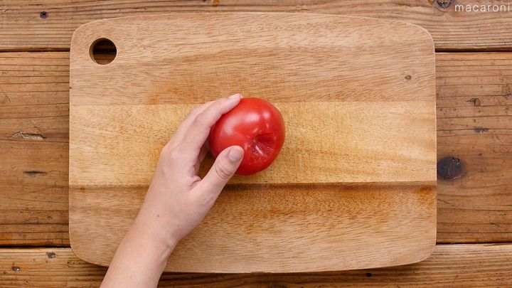 1: トマトはヘタをくり抜きます。