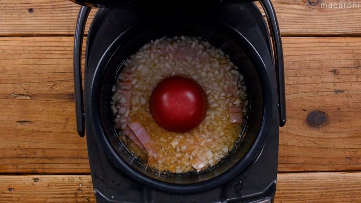 2: 炊飯釜に米、トマト、玉ねぎ、ベーコン、(a) を入れます。水を2合目盛りまで注ぎ、炊き込みモードで炊飯します。