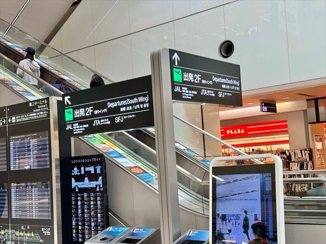 出発ロビーは2階なので、ここからエスカレーターでさらに上がる必要があるものの、さほど時間はかかりません。機内持ち込みのスーツケースを持った状態でも、何ら問題なくスムーズに移動できました。