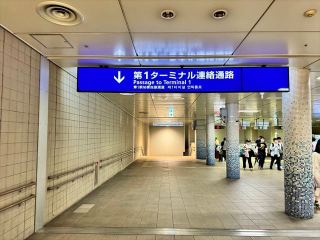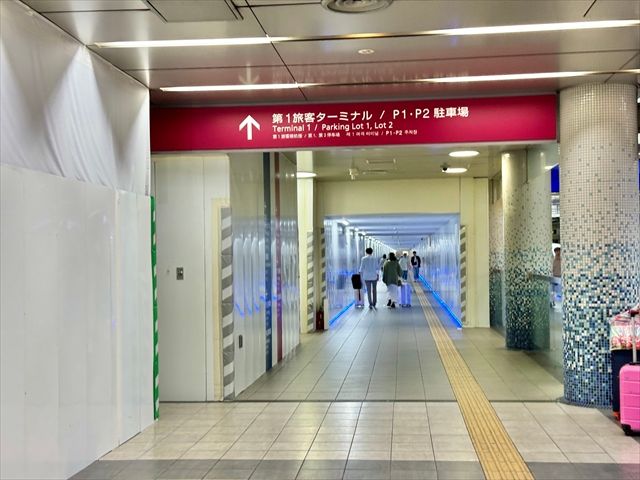 上がると見えるのがこの表示。はい、もう第1ターミナルに到着でございます! 思ったより早かった。ここまで、4分ほどで来られました。動く歩道が利用できるようになれば、さらに楽に移動できますね。