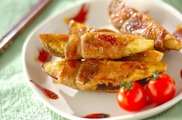 ナスを薄切りの豚肉で巻いた「かさ増し」レシピ。ここでは大葉と梅肉を一緒に巻いていますが、ない場合は味噌を巻いても良いでしょう。ナスが豚肉の油を吸ってとってもジューシー!