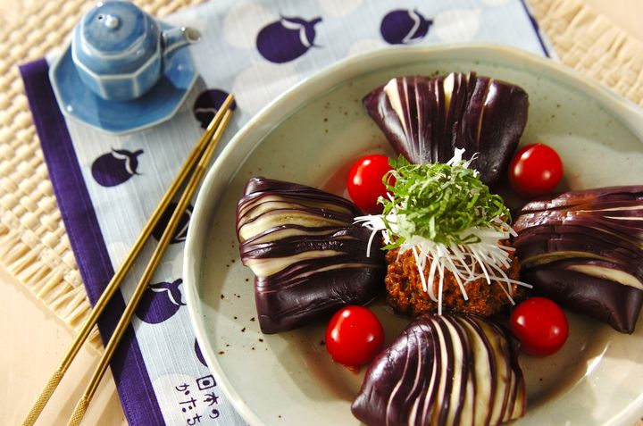 オーブンで焼いたナスを、しゃぶしゃぶ肉とだし汁に漬けて冷やした一品。そのまま食べてもおいしいですが、夏場はそうめんと一緒に食べても良いでしょう。ナスの甘味が存分に味わえる一品です。