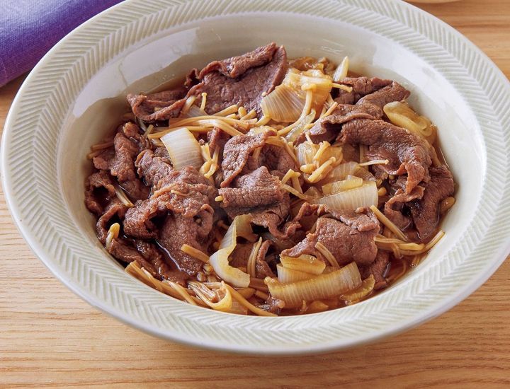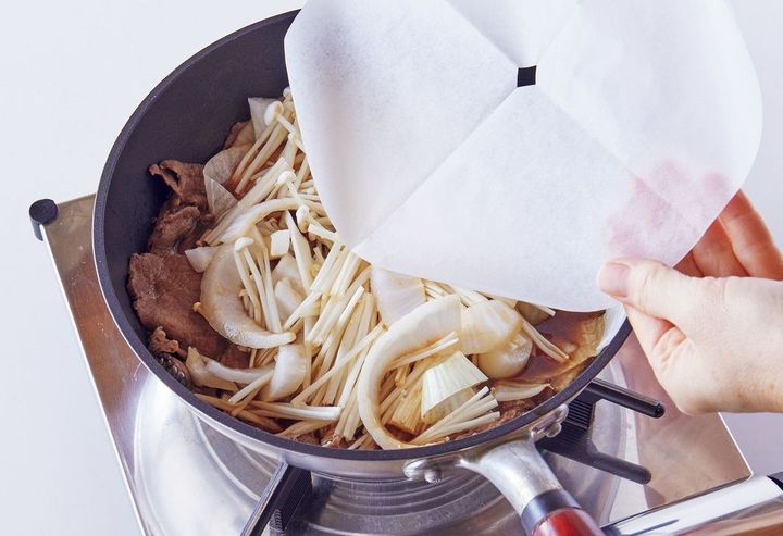 直径24cmのフライパンに煮汁の材料を入れて中火で煮立て、牛肉を加える。アクを取り、玉ねぎ、えのきを加え、落としぶた※をして弱火で10分ほど煮る。