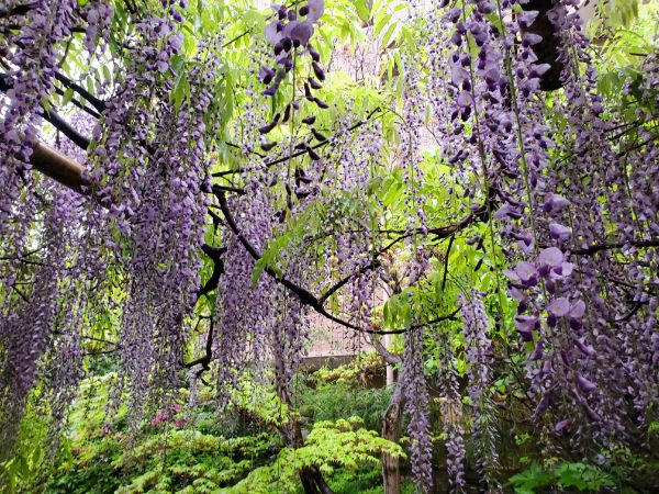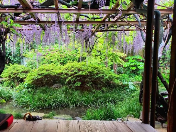 縁側から望む藤棚もとってもきれい!!紫色の他にも白い藤の花もありました。 この日は雨でしたが、雨に濡れた藤の花がしっとりして風流でした。 藤の花以外のもツツジの花や紅葉なども植えられており、どの季節も楽しめそうでした!