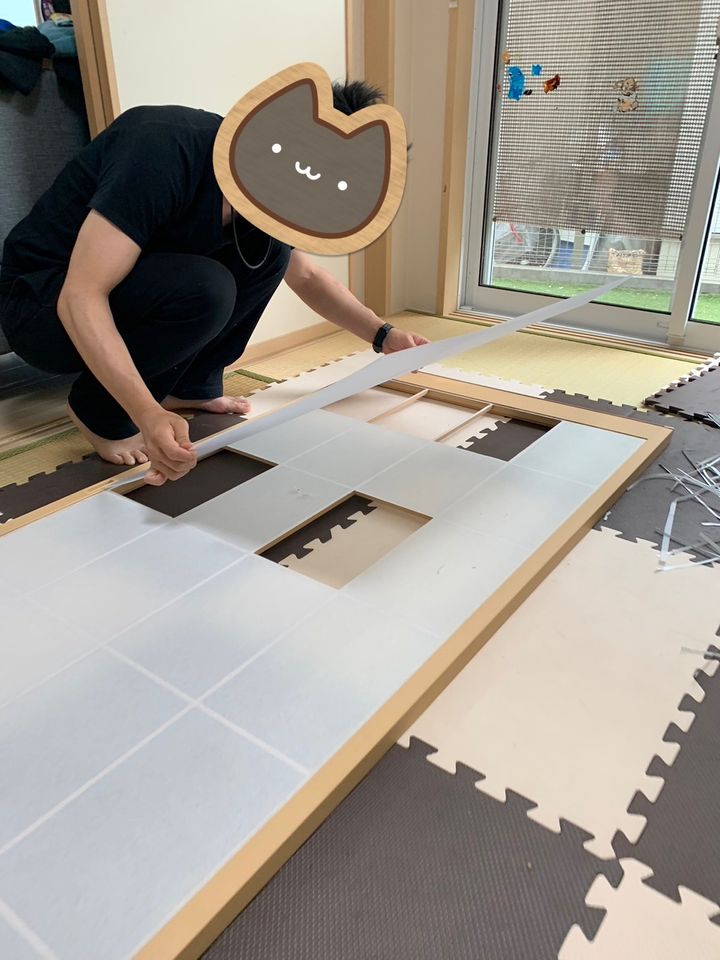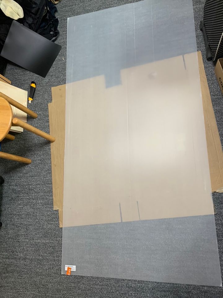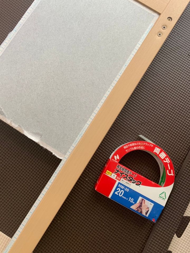 そして、両面テープを枠に貼り(縦も横も、取れないように全部)養生パネルを貼り付ける。