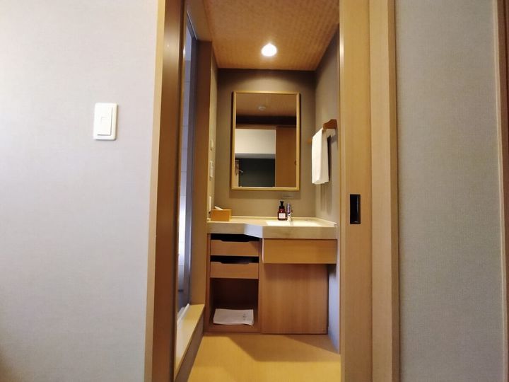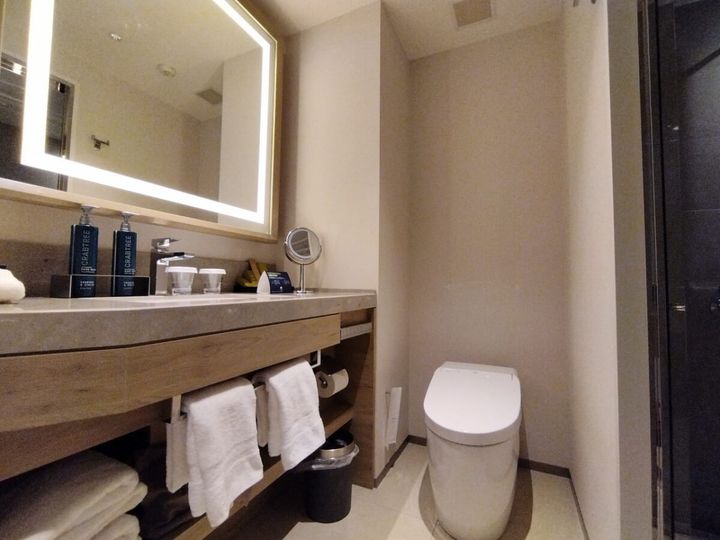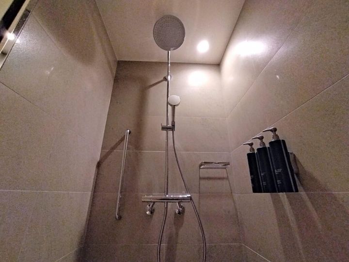 パウダースペースも広々していて、ハリウッドミラー仕様。シャワーブースのみですが手持ちシャワーに加えて、大口径のレインシャワーが備わります(デラックスルームはバスタブ完備)。
