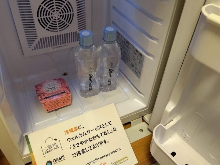 冷蔵庫の中には、ミネラルウォーターに加えてウェルカムスイーツもあるのが“野乃”のおもてなし。