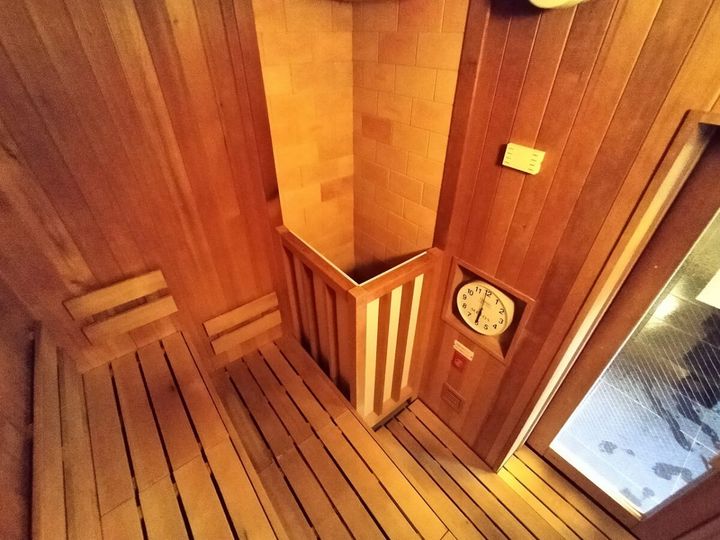 男性大浴場には、2段6名ほどが利用できるサウナも完備されている充実度。水風呂はありませんが、専用シャワーが設けられています。