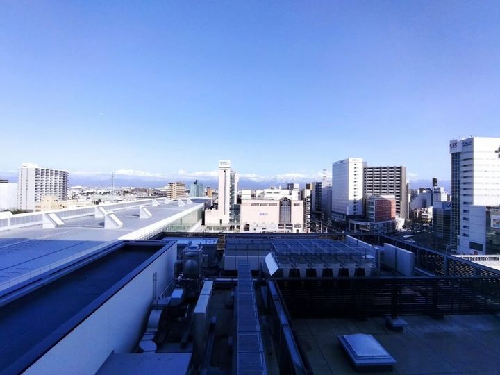 東側の客室からは、天気がよければ富山駅を眼下に立山連峰の爽快な眺めを楽しめるので、ぜひリクエストしてください。