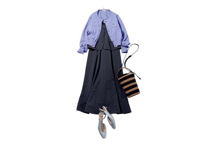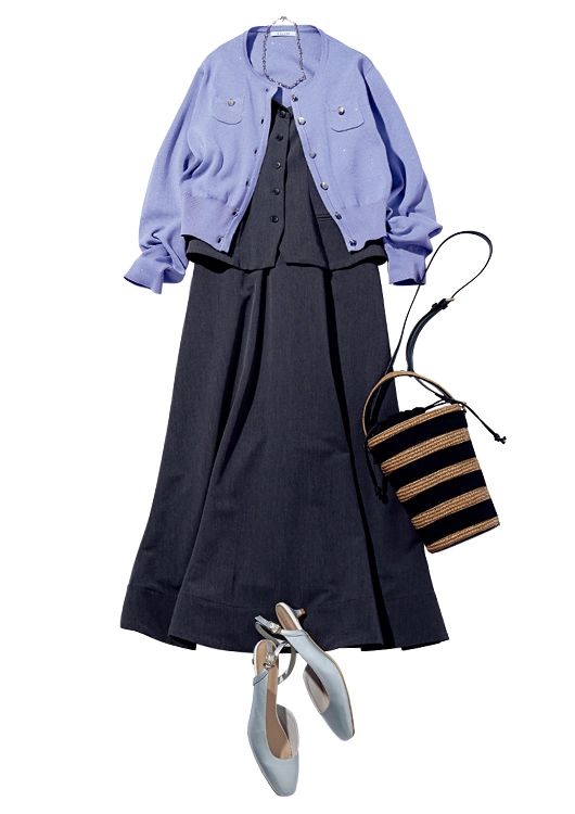 コルセット風ジャンスカ¥19,800/SNIDEL ルミネ新宿2店 ニットカーディガン¥18,700/カデュネ シルバーパンプス¥17,600/Stola. バケツバッグ¥6,930/カシュカシュ(アンビリオン) ネックレス(2本セット)¥990/GU