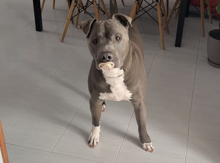 どこから持ってきたの? おしゃぶりを見つけて嬉しそうな犬さん。