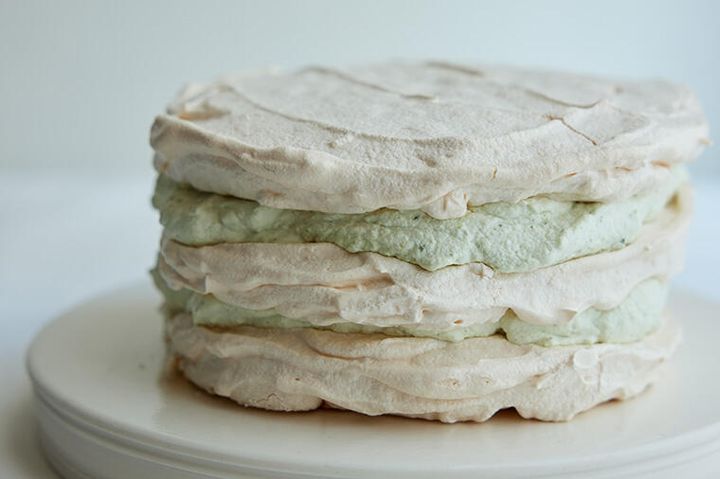 メレンゲ1枚に⑦の半量を塗り広げ、メレンゲ1枚をのせる。残りの煎茶クリーム、残りのメレンゲの順に重ね、冷蔵庫で1時間休ませる。