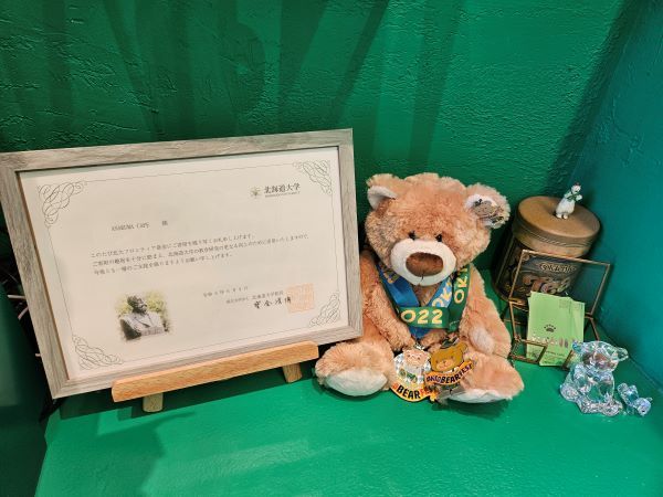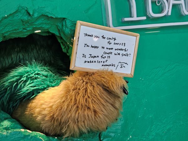 カフェ内ではクマさんの声を聞くことはなく、手のジェスチャーや、ホワイトボードの筆談でコミュニケーションを取ってくれます。海外からのカップルには英語にて。私には日本語でメッセージを書いてくれました。