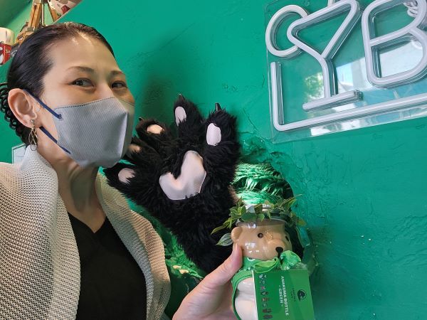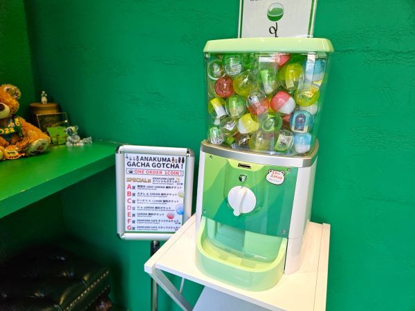 ドリンクの完成を待つ間にも、クマさんの手との交流が続きます。飴やガチャ用メダルを渡してくれました。ガチャには、チョコレートや次回1杯無料券などが当たるクーポンが入っています。
