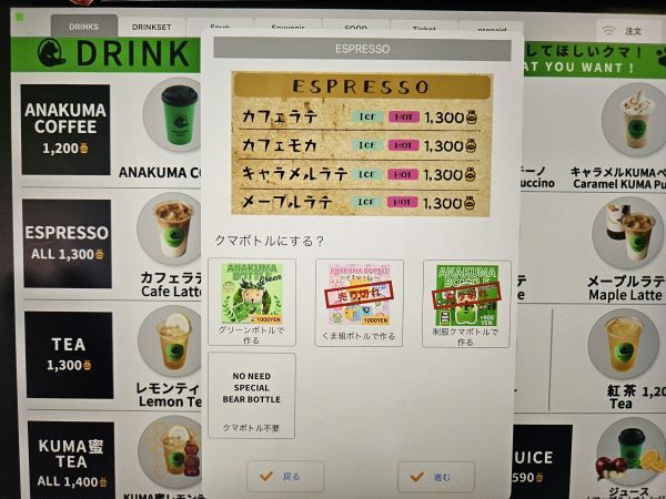 私は、ドリンク「カフェラテ(コールド)」を選び、容器を「クマボトル」で注文しました。 カフェラテ1,300円とグリーンクマボトル1,000円で、合計2,300円です。