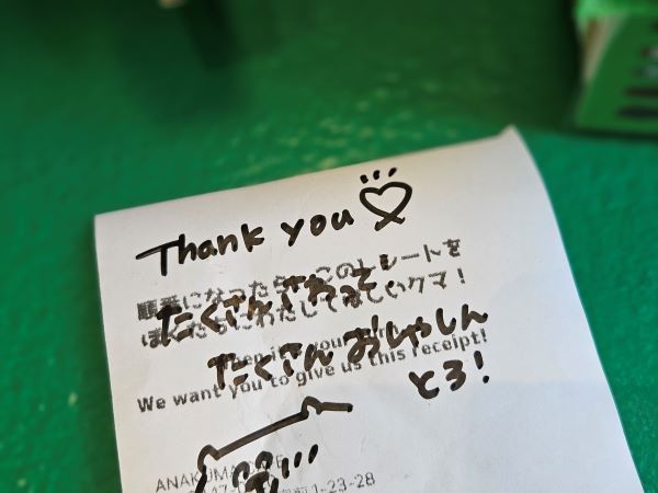 クマさんに渡したレシートは、確認後、メッセージ付きで戻ってきました。