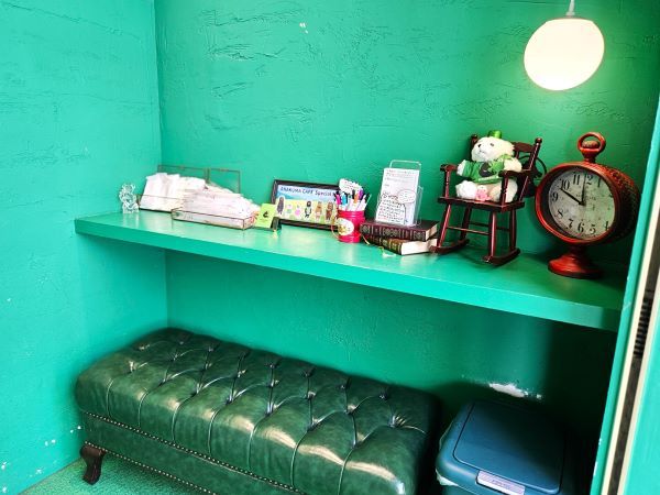 グリーンの壁に囲まれたカフェスペースに入ると、壁に穴が開いているところがあります。この穴からドリンクなどを受け取ります。