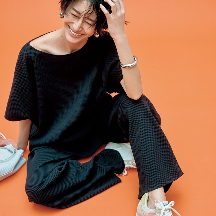 ワッフルトップス¥25,300 ワッフルパンツ¥27,500(ともにル フィル/ル フィル ニュウマン新宿店)イヤリング¥8,800(アビステ)バングル¥13,750(エイチアッシュ/フォーティーン ショールーム)バッグ¥24,200(ノマディス/ノーベルバ)スニーカー¥25,300(ノヴェスタ × デミルクス ビームス/デミルクス ビームス 新宿)