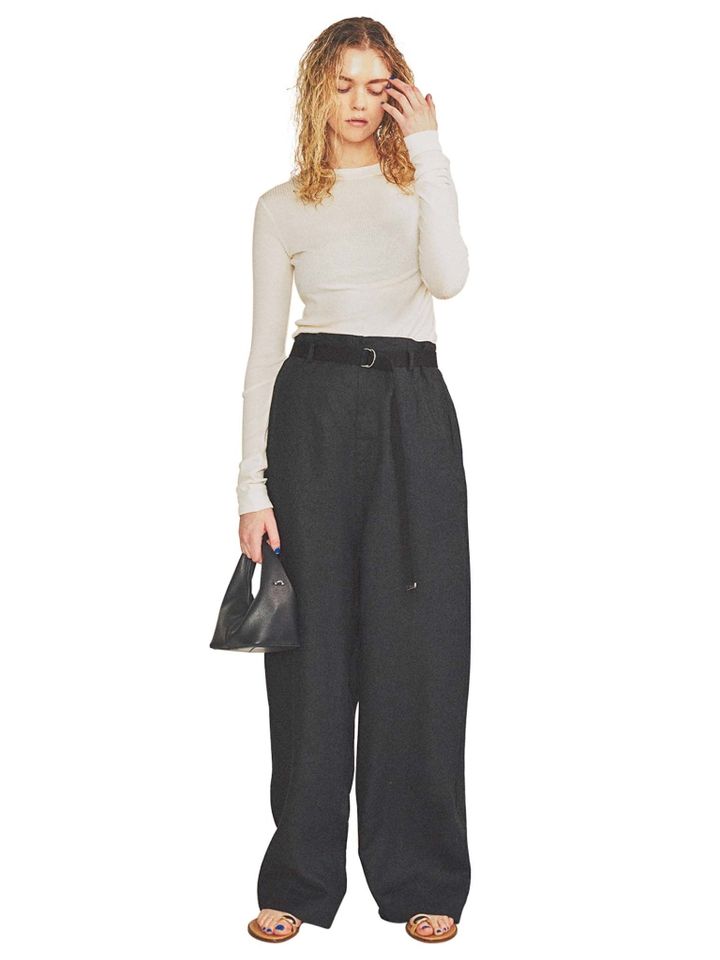 【1】黒に軽さが加わることで、きちんと感とリラックス感が共存した1本に。幅広シルエットも相まって、トップスに凝らずとも絵になる見た目に仕上がるから、合わせる服やその日の気温にも左右されない優秀作。