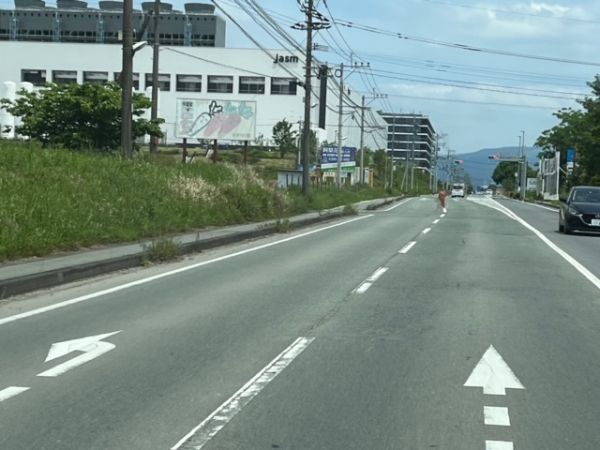 まっすぐ行けば菊池市の中心へと続く道だ。 道の駅旭志を越え、ジョイフル熊本旭志店が見えたら、その信号を右折。