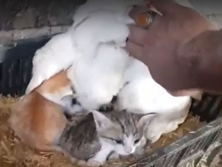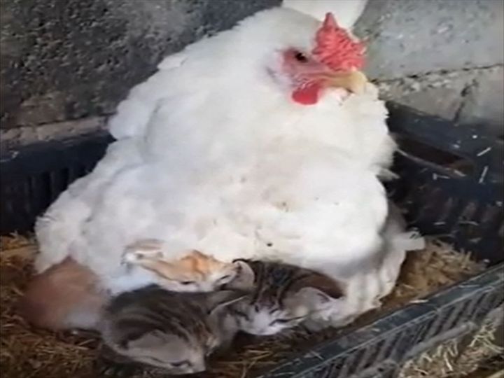 雌鶏さんの羽の下から姿をあらわしたのは・・・ きゃわわな子猫でした!!