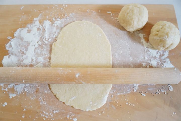 の生地を4等分して丸め、打ち粉をした上でめん棒で楕円形に伸ばす。