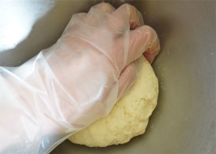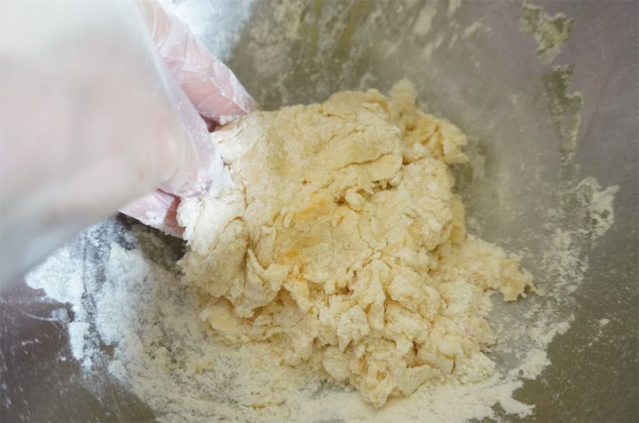 はじめは粉っぽくホロホロとしています。ボウルの側面についた粉は生地で取りながらこねます。