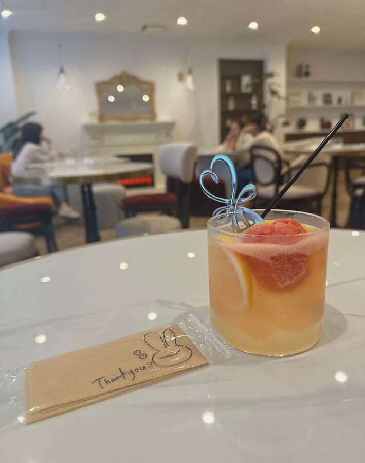 ドリンクは自家製レモネードを注文。甘酸っぱいブラッドオレンジのシャーベットが入り、最初はシャーベットとして、次にレモネードと混ぜて味変して楽しめます!