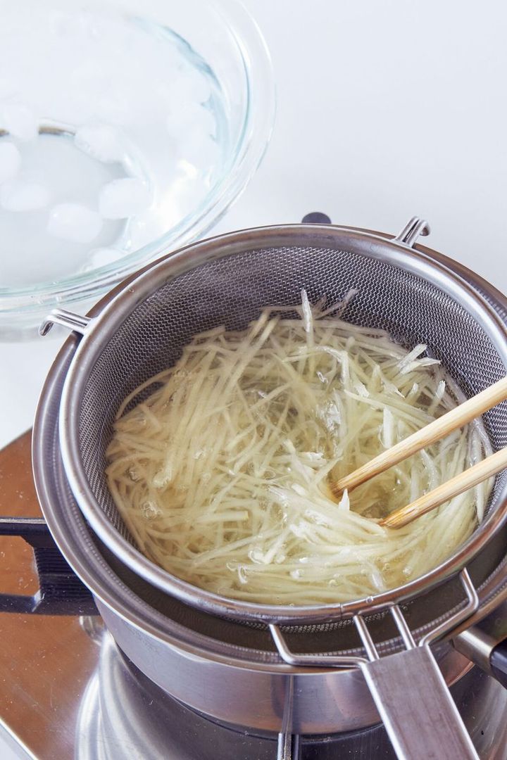 じゃがいもは表面のでんぷんを洗い流してからさっとゆでると、しゃきっとした食感に。手つきの耐熱のざるなどに入れて一気に湯に沈めて混ぜ、じゃがいもが透き通ったらすぐに引き上げると火が通りすぎるのを防げます。