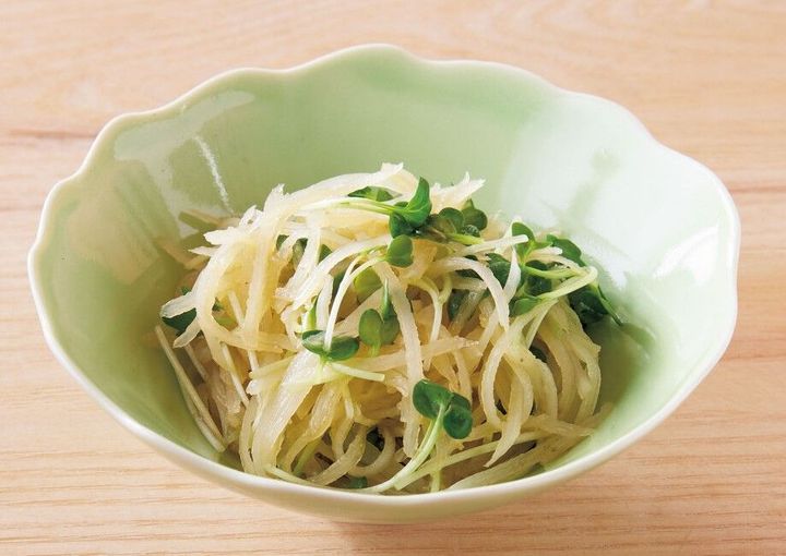 (1)じゃがいもは皮をむき、スライサーでごく細いせん切りにする。水にさっとさらし、あれば手つきの耐熱のざるに上げる。貝割れ菜は根元を切り、長さを半分に切る。ボールに酢、水各大さじ1、塩小さじ1/3、砂糖、しょうゆ各小さじ1、練りわさび小さじ1/2を入れて混ぜる。