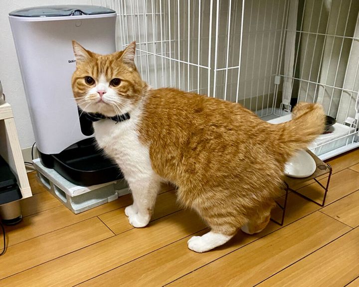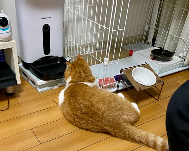 そろそろカリカリごはんの時間だよね? 給餌器の前で待機するね……。
