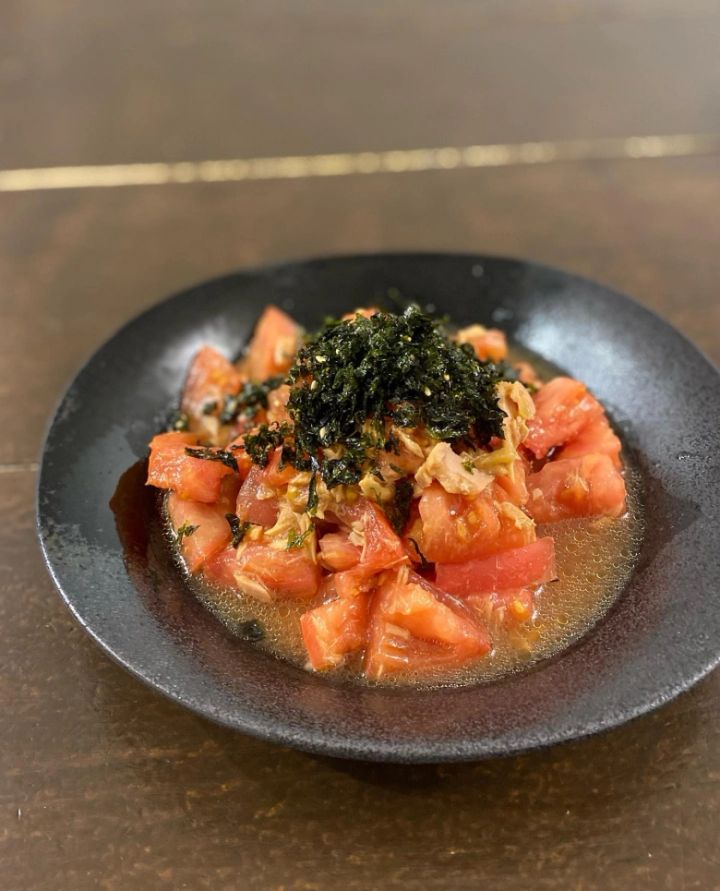 チャーハンの箸休めにピッタリな、甘酸っぱいトマト。ツナや韓国海苔でコクもプラスした、爽やかながらもクセになる味わいです。味のバランスが良くなるのはもちろん、食卓をパッと明るくしてくれます。