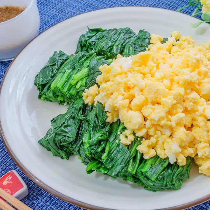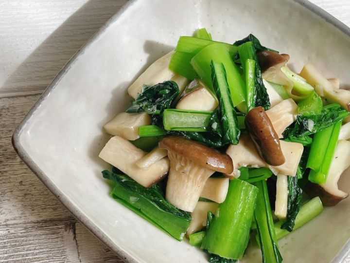 味がしっかりついたチャーハンには、シンプルな付け合わせがベストマッチ。小松菜のシャキシャキした食感がアクセントになります。