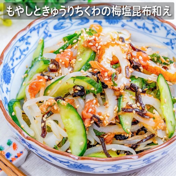 茹でたもやしにちくわときゅうりを合わせるだけの簡単副菜です。塩昆布とごま油で箸がどんどん進むこと間違いなし。ヘルシーな食材を使った副菜なので、カロリーが高めなチャーハンのおかずにぴったりです。