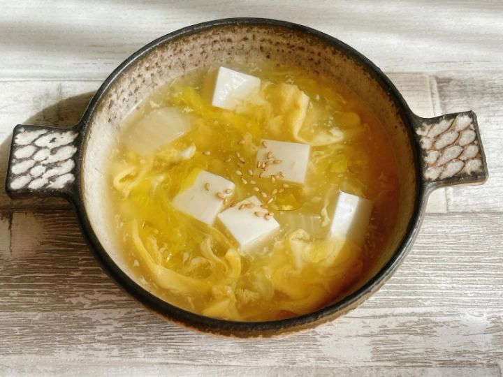 タンパク質やカリウム、ビタミンなどの栄養素がしっかり摂れる豆腐と白菜のスープ。とろみをつけることで、チャーハンの喉越しも良くなります。味のバランスはもちろん、サッと食べやすい献立になるでしょう。