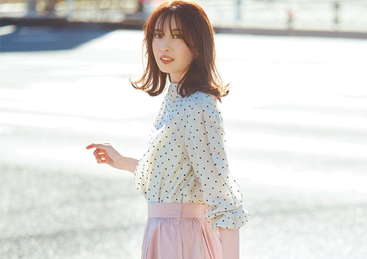 移動の多い日は、シワになりにくいふんわりスカートに小さめドットのたらこスパ風カラーでアクティブに。主役級なパフスリーブトップスはボリュームがあるのに華奢見え!