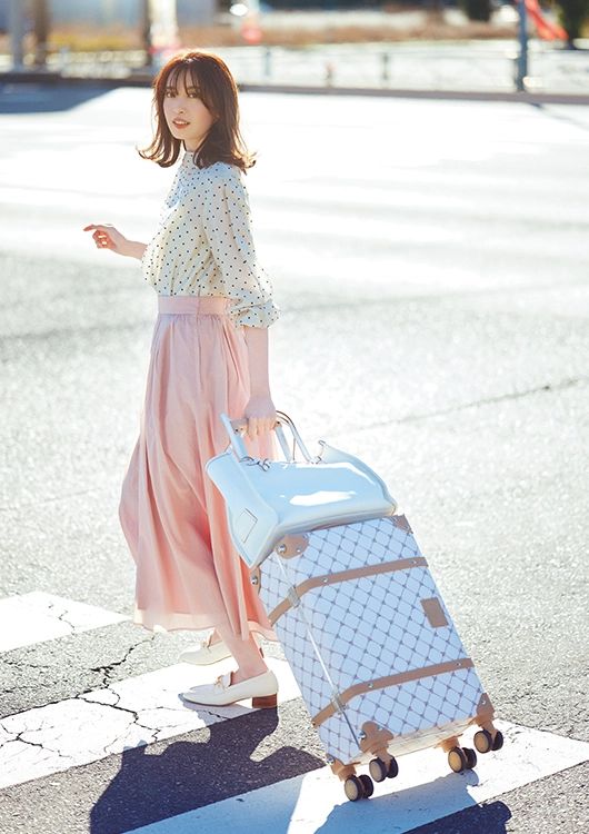 セットアップ(スカート)¥16,940/アンクレイヴ スタンダード(オンワード樫山) ドットブラウス¥12,100/ミラ オーウェン ルミネ新宿2店 トートバッグ¥69,300/ジャンニ キアリーニ(ジャンニ キアリーニ 銀座店) ローファー¥17,600/Stola. キャリーケース¥24,200/& シュエット(& シュエットギャラリー 池袋サンシャインシティアルパ店)