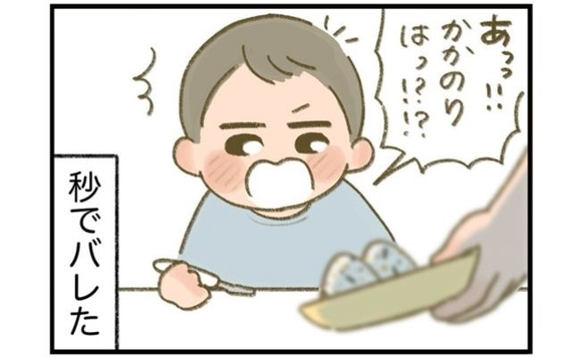 2020年2月生まれの男の子・たろうくんのママ・てんてこまいさんが備忘録としてゆる〜く描く、親バカ全開!?な育児絵日記。ある日、おにぎり用ののりを買い忘れたてんてこまいさん。のり無しのおにぎりを、何も言わずにしれっと出してみると……!?