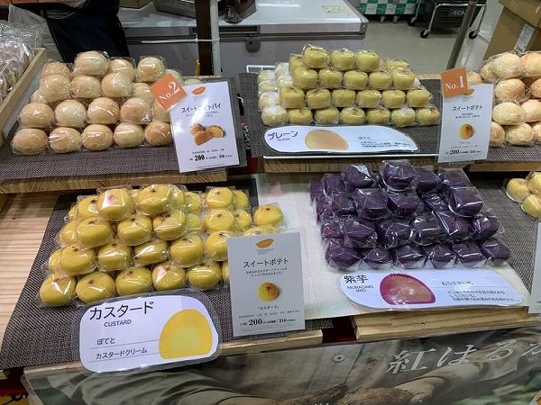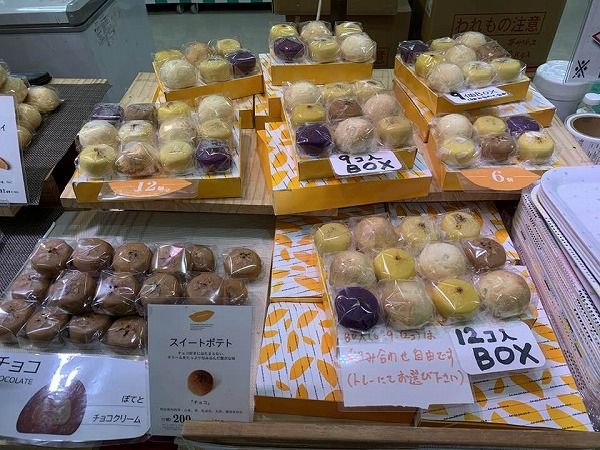 高く積まれたスイートポテトたちです。商品名が大きく書かれているので、人が多いタイミングでもどれがどういう商品か分かりやすくて助かります。