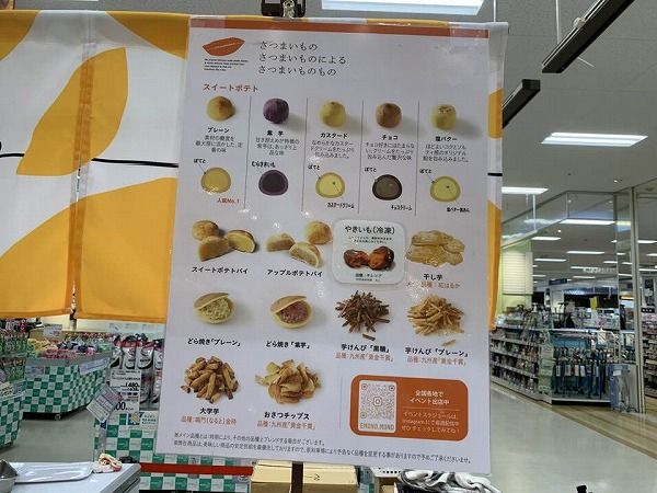分かりやすいメニュー表が置いてあります。スイートポテトをはじめ、パイやどら焼き、チップスなどなど。