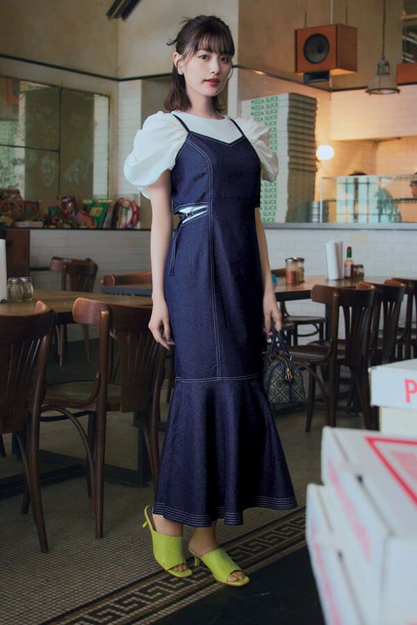 ふんわりした今っぽスリーブでデニムジャンスカをよそゆき顔に。袖に華感が集中したカットソーは、ジャンスカのインナーに好都合。タイトなジャンスカが、ふんわり袖とのメリハリで着映えます。