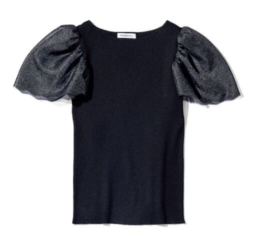 大人っぽさ漂うラメ素材のチュール袖。身ごろがタイトなのでジャンスカにインしやすく、ドレッシーな袖がしっかりお目立ち。