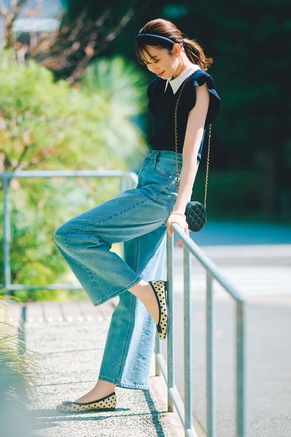 ワイドデニムパンツ¥9,460/NATURAL BEAUTY BASIC 襟付きニット¥9,790/Swingle(Swingle 有楽町マルイ店) バッグ¥2,690/神戸レタス カチューシャ¥26,400/アレクサンドル ドゥ パリ(ア レクサンドル ドゥ パリ GINZA SIX店) イヤリング¥28,600/アナプノエ、ブレスレット¥11,550/Hh(ともに14 SHOWROOM) パンプス¥13,750/ダイアナ(ダイアナ 銀座本店)