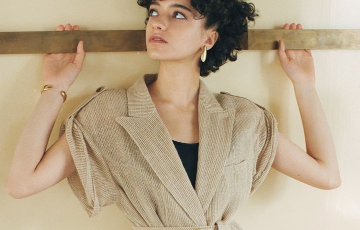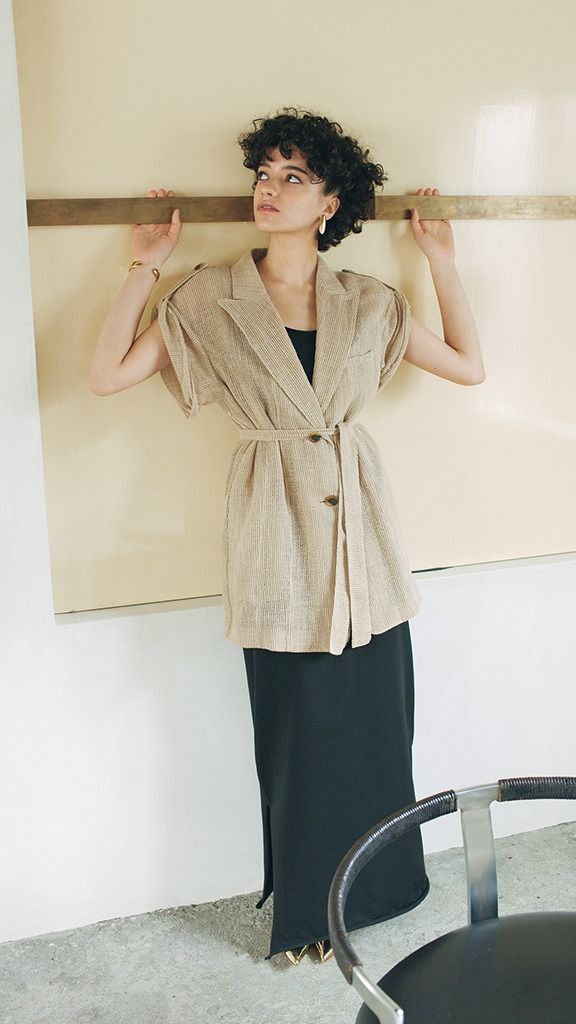 ウエストで締めてトップスのようにも見せれるベルトつきジャケットは、いかに重く見せないかに重点を。V字の首元や、ほぼシャツの素材感で軽やかに見せて。