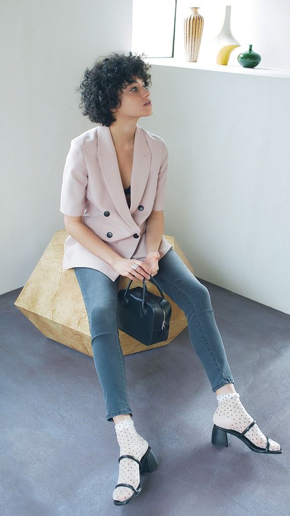 ボタンをとめると、まるで美形なトップスのようにフィットする半そでのジャケットが豊富に登場中。肌面積広めのインナーをチラリとのぞかせて、女性らしさもぬかりなく。