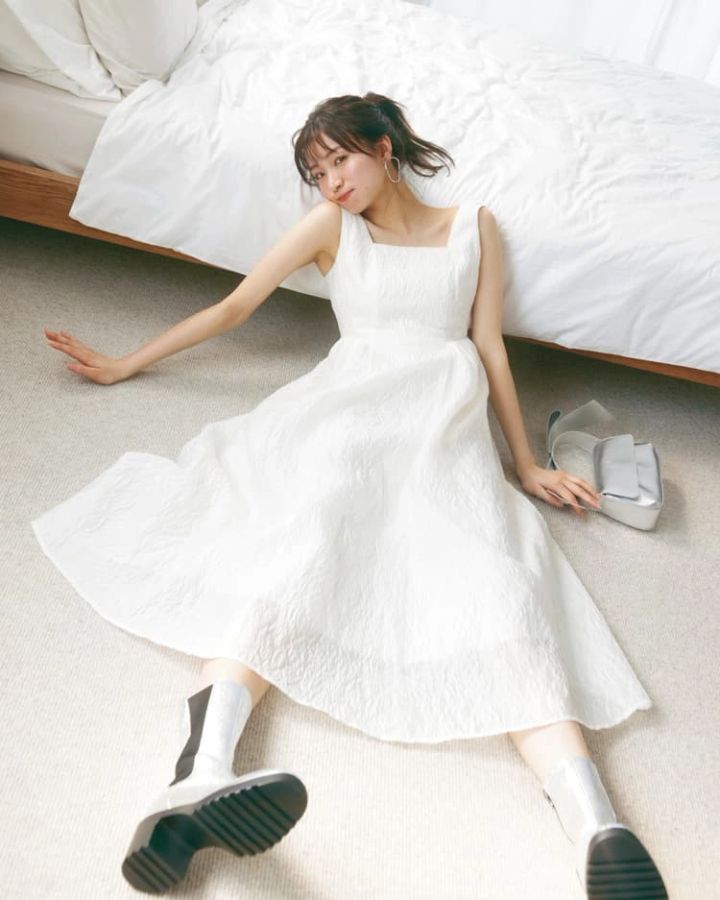 白ワンピース 12,100円/dazzlin イヤリング 2,530円/GOLDY バッグ 18,900円/チャールズ&キース(チャールズ&キース ジャパン) ブーツ 29,700円/ダイアナ(ダイアナ 銀座本店)