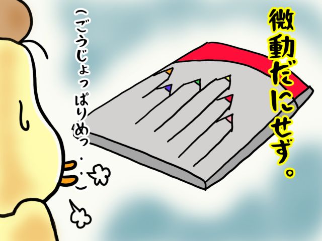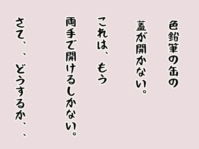 よんの助くんを抱っこしながら、さん太郎くんからの要求はなんとか片手で解決できたてる子さん。しかし、色鉛筆のふたが開かないから開けて欲しいというふた江ちゃんの要求が残っています。とりあえず片手で色鉛筆のケースの角を押してみたものの・・・ビクともしません。これはもう両手を使うしかなさそうです・・・。