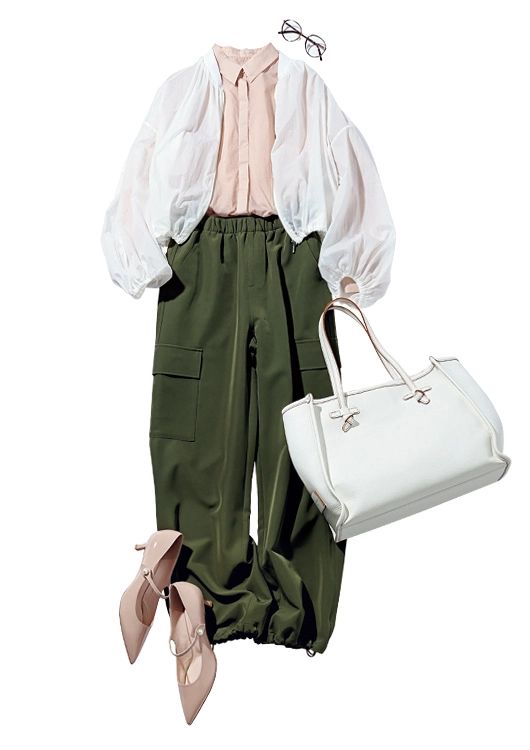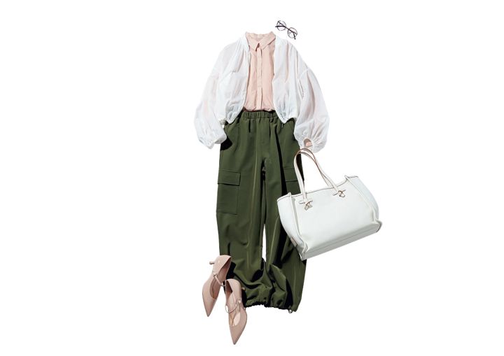 セットアップ(シャツ)¥14,960、シアーブルゾン¥17,930/ともにアンクレイヴ スタンダード(オンワード樫山) カーゴパンツ¥3,990/シューラルー(ワールド) トートバッグ¥69,300/ジャンニ キアリーニ(ジャンニ キアリーニ 銀座店) ストラップパンプス¥18,700/ダイアナ(ダイアナ 銀座本店) メガネ¥12,000/OWNDAYS