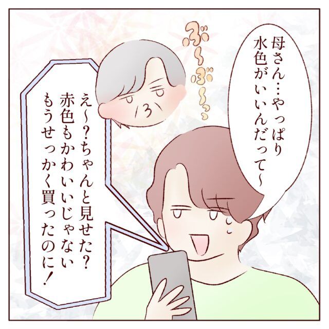 「え~?ちゃんと見せた?赤色もかわいいじゃない、もうせっかく買ったのに!」